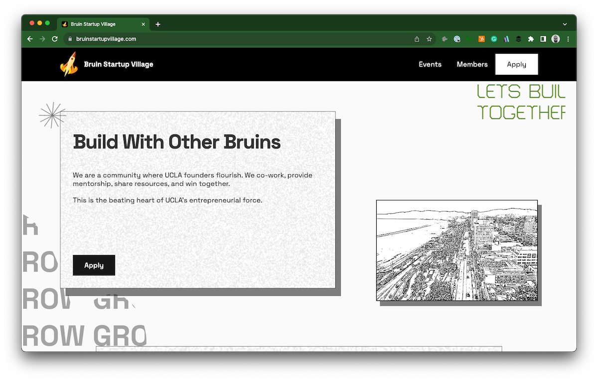 Lance likes to sell before he builds, and Bruin Startup Village was no different. He established the community first and focused on providing them value, before launching into building a website. However, like any other venture, you eventually need a home on the web where prospective customers, or in Lance’s case members, can find you and understand more about what you offer.